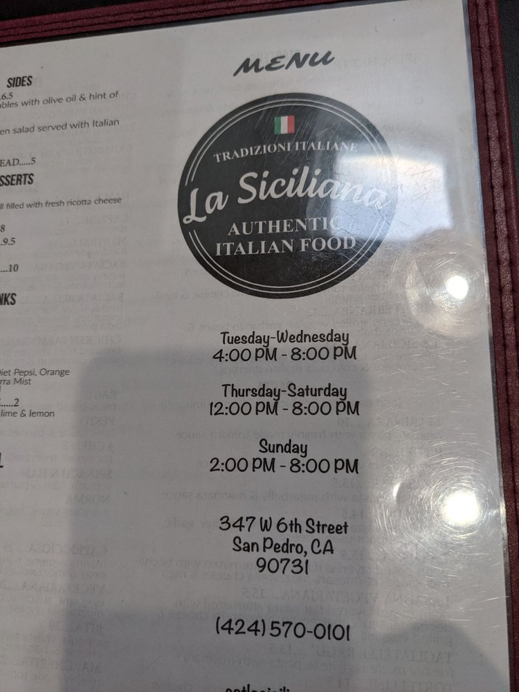 La Siciliana is a charming Sicilian restaurant located in San Pedro, California. This women-owned establishment offers a wide range of vegan and vegetarian options, making it a great choice for all dietary preferences. The menu features authentic Italian dishes, with customers raving about the lasagna, chicken piccata, shrimp and crab ravioli, and cannoli. The warm and welcoming atmosphere, coupled with friendly and attentive service, adds to the overall dining experience. With outdoor seating, free Wi-Fi, and a selection of beer and wine, La Siciliana provides a cozy setting for a delicious meal. Whether you're looking for a casual dining spot or a place to host a group event, this restaurant is sure to impress with its flavorful dishes and hospitable staff.